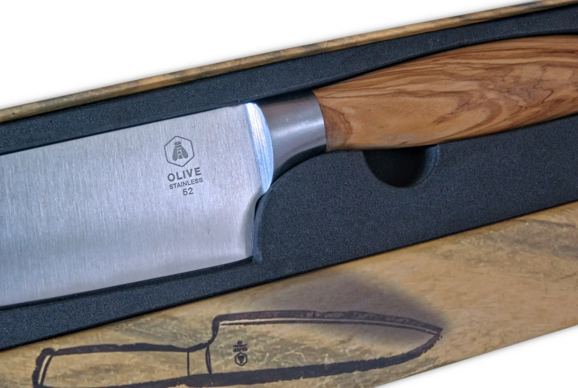Con empuñadura de madera de olivo, este cuchillo está fabricado con acero inoxidable ST52, que es un acero especial de muy alta resistencia mecánica, utilizado en una gran variedad de aplicaciones industriales. Para una experiencia de corte precisa y suave. Largo 30 cms