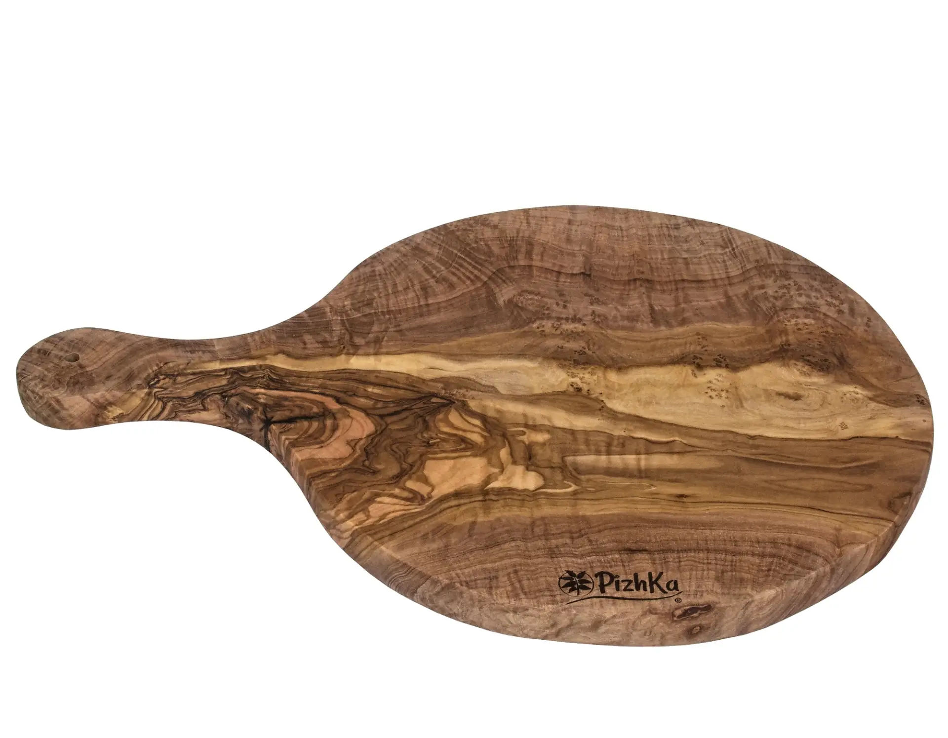 Tabla en Madera de Olivo con asa de agarre perforada, largo 38 cms y espesor de 1,8-2 cms aproximadamente.