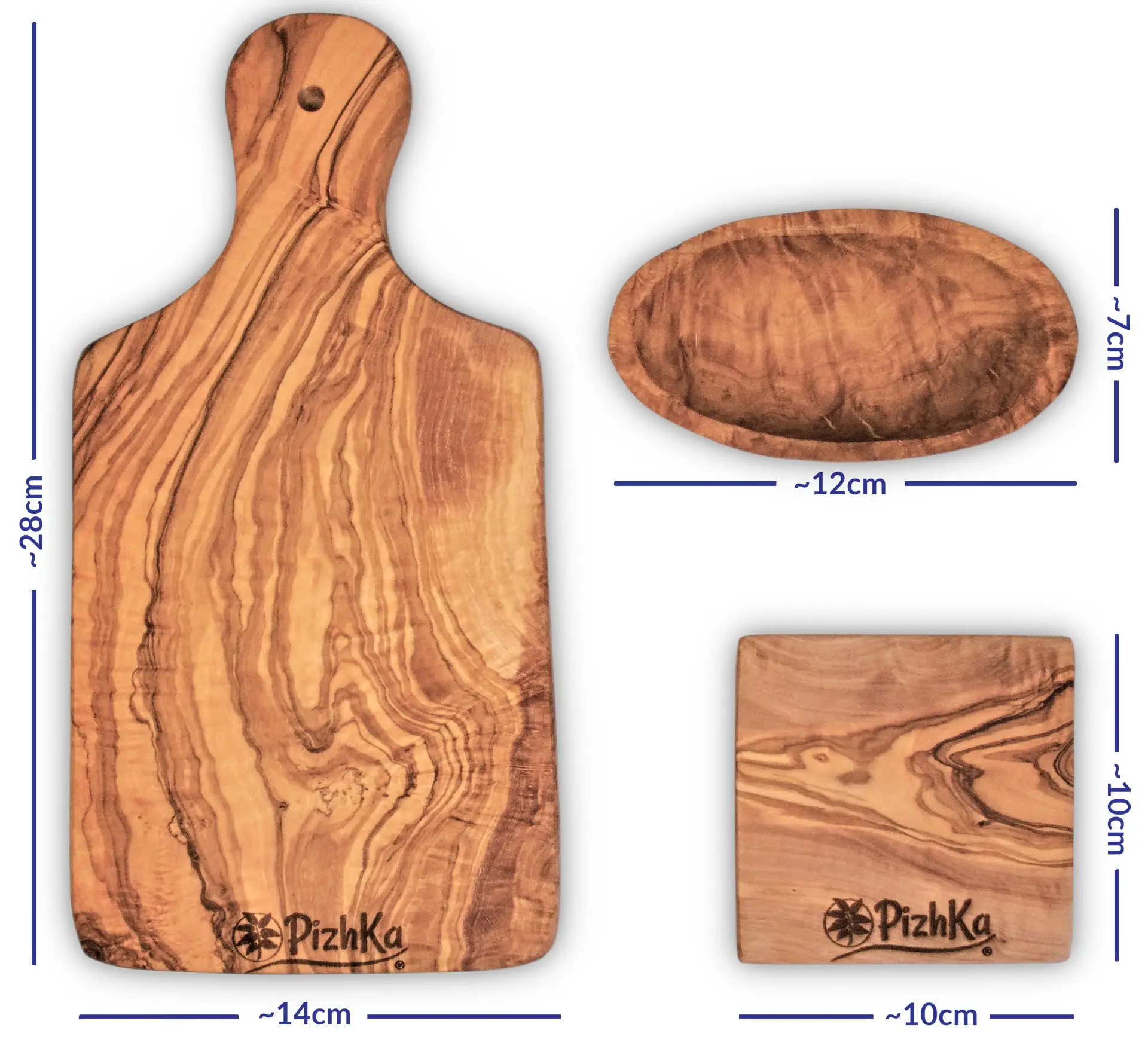 NOTA: Al ser madera de olivo las formas y medidas de cada tabla pueden variar ligeramente segun la veta y el corte de la madera.